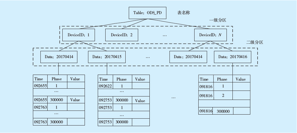 電力設(shè)備監(jiān)測(cè)數(shù)據(jù)的兩個(gè)最基本屬性是設(shè)備編號(hào)和數(shù)據(jù)采集時(shí)間。為了提升查詢和數(shù)據(jù)分析的性能,使用設(shè)備ID作為一級(jí)分區(qū),采集日期作為二級(jí)分區(qū),從而可以有效減少數(shù)據(jù)查詢的范圍,提升訪問(wèn)性能。