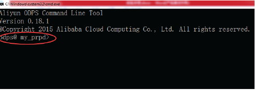 access_id和access_key可從阿里云管理控制臺(tái)獲取,project_name配置為創(chuàng)建好的MaxCompute項(xiàng)目即可。配置完成后,運(yùn)行<ODPS_CLIENT>/bin/odpscmd,進(jìn)入交互模式,會(huì)出現(xiàn)項(xiàng)目名稱作為提示符。ODPS cmd控制臺(tái)如