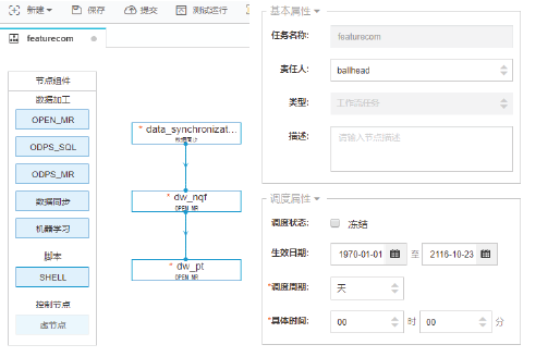 為了實(shí)現(xiàn)對(duì)監(jiān)測(cè)數(shù)據(jù)的統(tǒng)計(jì)特征計(jì)算,需要使用2個(gè)MapReduce任務(wù)來(lái)完成計(jì)算,并將計(jì)算任務(wù)串聯(lián)起來(lái)。為了完成任務(wù)串聯(lián)和任務(wù)調(diào)度的周期執(zhí)行,本文使用阿里云數(shù)加平臺(tái)的大數(shù)據(jù)開發(fā)套件來(lái)設(shè)計(jì)實(shí)現(xiàn)計(jì)算任務(wù)的工作流,并配置任務(wù)調(diào)度策略。特征計(jì)算的工作流和調(diào)度配置界面如
