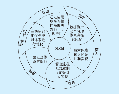 上述目標(biāo)必須納入數(shù)據(jù)資產(chǎn)安全管理體系中,在職責(zé)明確、分級(jí)明晰的框架指導(dǎo)下,才能最大程度地發(fā)揮其約束作用。尤其是,要做到數(shù)據(jù)資產(chǎn)的安全管理,必須在數(shù)據(jù)分類(lèi)分級(jí)機(jī)制、數(shù)據(jù)全生命周期管理(Data Life Cycle Management,DLCM)、數(shù)據(jù)使用授權(quán)體系規(guī)范管理的前提下,由相關(guān)人員在權(quán)限范圍內(nèi)對(duì)數(shù)據(jù)進(jìn)行訪問(wèn)及提取應(yīng)用,其整體構(gòu)成如