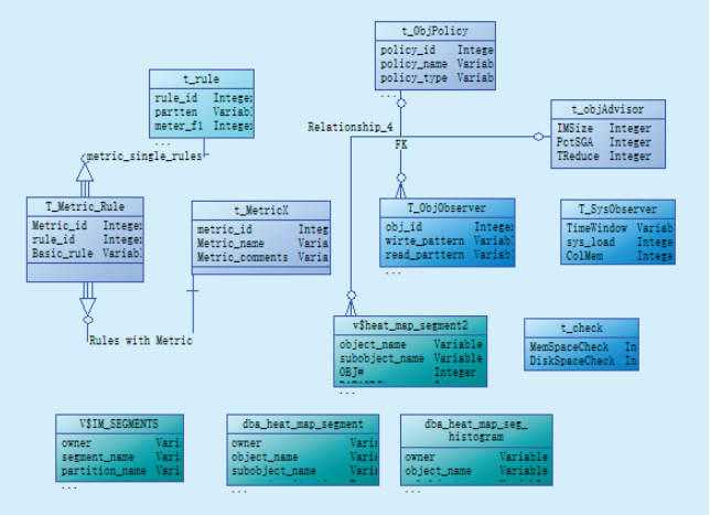 決策引擎的決策過程基于數(shù)據(jù)庫熱圖的幾個(gè)基礎(chǔ)視圖,如:v$heat_map_segment,以及本身策略庫的基礎(chǔ)表T_RULE和記錄決策引擎制定出的數(shù)據(jù)生命周期管理的方案T_OBJPOLICY,還有引擎運(yùn)算使用的數(shù)據(jù)庫和操作系統(tǒng)各種狀態(tài)指標(biāo)的采集表。