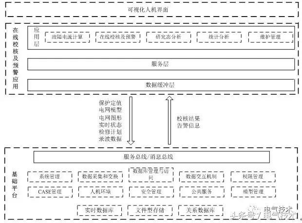 繼電保護(hù)定值在線校核屬于SG-OSS系統(tǒng)中實(shí)時(shí)監(jiān)控與預(yù)警類的一個(gè)應(yīng)用,其總體架構(gòu)圖如圖1所示[9],包括基礎(chǔ)平臺(tái)和在線校核及預(yù)警應(yīng)用兩大模塊,其中,后者向前者傳輸定值、模型、圖形、狀態(tài)、檢修方式、故障錄波等數(shù)據(jù),前者向后者傳輸校核及報(bào)警數(shù)據(jù)。