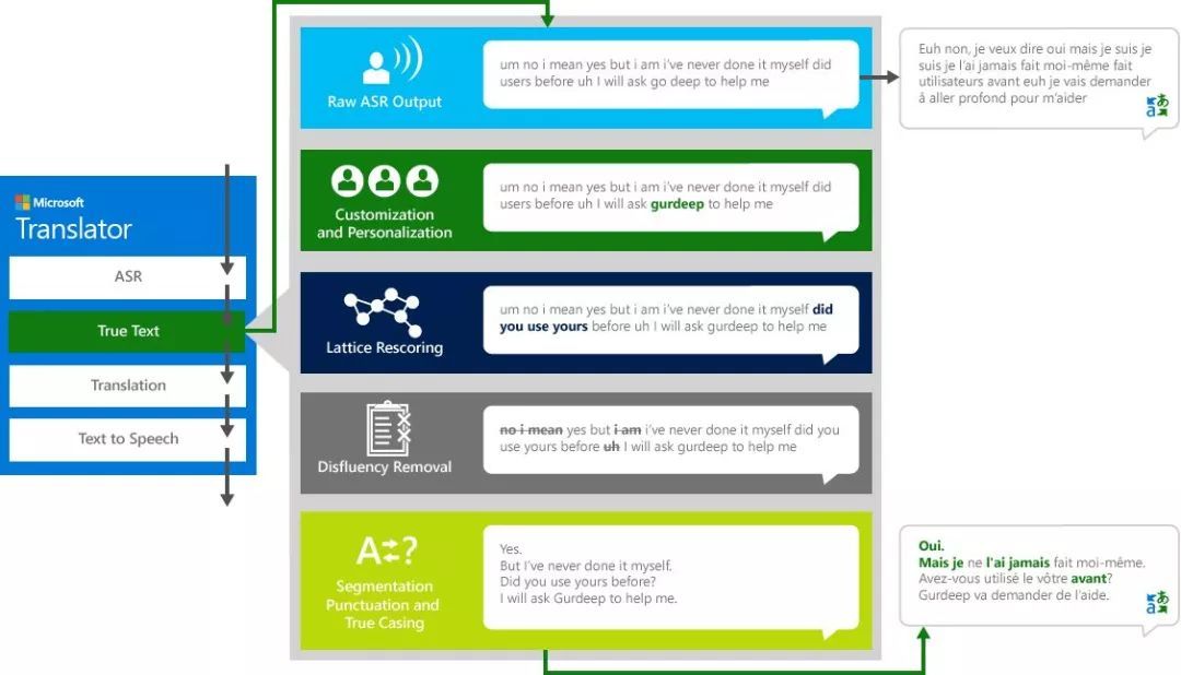 我們?nèi)粘5恼f話并不完美,常常不如自己認為的那樣清晰和流利。憑借 TrueText技術,可以刪除口語中不流利的部分(贅詞,如"嗯"、"啊"、"和"、"比如")、口吃和重復,使文本經(jīng)轉換更貼近地反映用戶意圖。還通過添加斷句、正確標點符號和大小寫,使文本更易讀和更易譯。為取得這些成果,我們將數(shù)十年的研究成果應用于開發(fā) Translator的語言技術,從而創(chuàng)建出 TrueText。下圖通過真實的示例演示 TrueText的執(zhí)行過程。