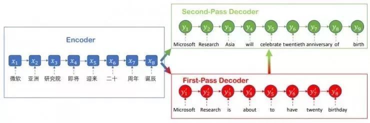 “推敲”二字可以認為是來源于人類閱讀、寫文章以及做其他任務時候的一種行為方式,即任務完成之后,并不當即終止,而是會反復推敲。微軟亞洲研究院機器學習組將這個過程沿用到了機器學習中。推敲網(wǎng)絡具有兩段解碼器,其中第一階段解碼器用于解碼生成原始序列,第二階段解碼器通過推敲的過程打磨和潤色原始語句。后者了解全局信息,在機器翻譯中看,它可以基于第一階段生成的語句,產(chǎn)生更好的翻譯結果。