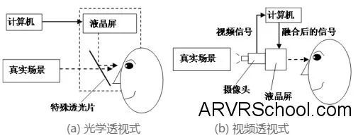 頭盔顯示式被廣泛應(yīng)用于增強(qiáng)現(xiàn)實(shí)系統(tǒng)中,用于增強(qiáng)用戶的沉浸感。按照實(shí)現(xiàn)原理大致分為光學(xué)透視式和視頻透視式兩類,分別如圖所示。光學(xué)透視式增強(qiáng)現(xiàn)實(shí)系統(tǒng)具有簡單、分辨率高、沒有視覺偏差等優(yōu)點(diǎn),但它同時(shí)也存在著定位精度要求高、延遲匹配難、視野相對(duì)較窄和價(jià)格高等缺陷。視頻透視式增強(qiáng)現(xiàn)實(shí)系統(tǒng)采用的基于視頻合成技術(shù)的穿透式HMD(Video See-through HMD),利用攝像機(jī)采集到的真實(shí)環(huán)境的視頻信息與計(jì)算機(jī)生成的三維虛擬信息相融合,從而加強(qiáng)用戶對(duì)真實(shí)世界數(shù)據(jù)信息的認(rèn)知能力。