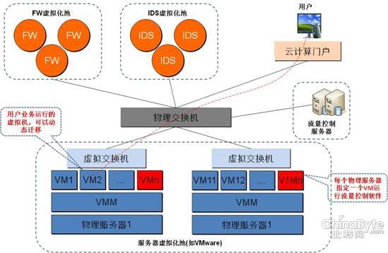 l 部署流量控制服務(wù)器:它是流量控制管理的中心,接受并部署用戶流量的安全策略,當(dāng)用戶業(yè)務(wù)虛擬機(jī)遷移時(shí),負(fù)責(zé)流量牽引策略的遷移落地;該服務(wù)器可以是雙機(jī)熱備,提高系統(tǒng)安全性,也可以采用虛擬機(jī)模式。同時(shí),在虛擬計(jì)算資源池內(nèi)安裝流量控制引擎:具體方法是在每個(gè)物理服務(wù)器內(nèi)開(kāi)一個(gè)虛擬機(jī)運(yùn)行流量控制引擎,負(fù)責(zé)引導(dǎo)該物理服務(wù)器上所有虛擬機(jī),按照安全策略進(jìn)行流量的牽引;