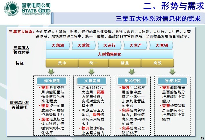 - 目標(biāo):繼承、完善SG186工程建設(shè)成果,深化應(yīng)用,不斷創(chuàng)新,打造集約柔性的一體化信息平臺(tái)、融合智能的業(yè)務(wù)應(yīng)用、統(tǒng)一高效的保障體系,提升公司科學(xué)發(fā)展質(zhì)量和速度,支撐堅(jiān)強(qiáng)智能電網(wǎng)和三集五大體系建設(shè),達(dá)到國(guó)際領(lǐng)先水平,全面支持推進(jìn)“兩個(gè)轉(zhuǎn)變”、建設(shè)“一強(qiáng)三優(yōu)”現(xiàn)代公司的戰(zhàn)略目標(biāo)。