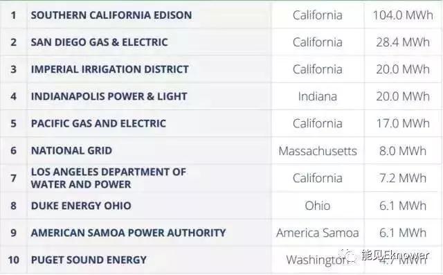 表1 2016年美國(guó)公用事業(yè)公司儲(chǔ)能安裝容量排名