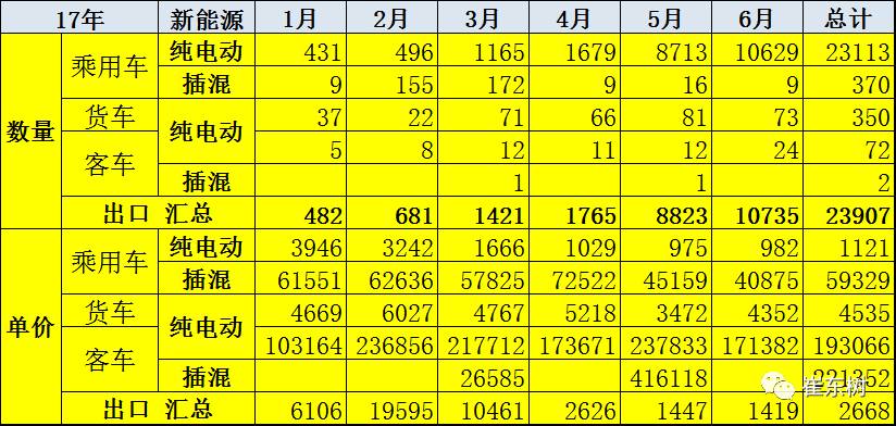 17年6月的新能源乘用車出口主要是孟加拉、韓國、美國、印度等市場,部分小于4位數(shù)的出口單價就不寫上為好。由于總體單價在1642美元,檔次不是很高。