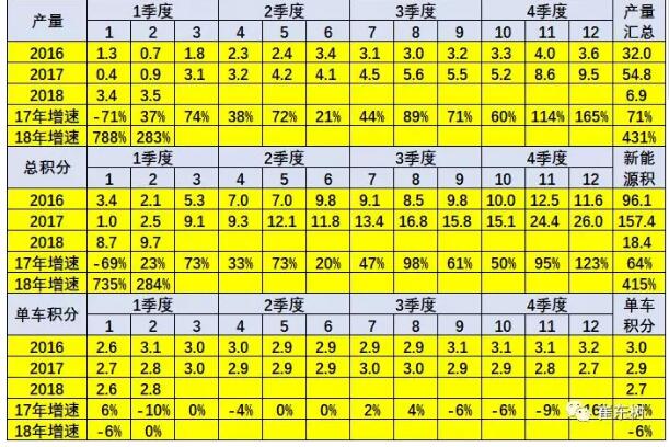 18年1-2月的新能源車生產(chǎn)6.9萬臺(tái),形成新能源積分18萬分,每臺(tái)乘用車平均2.7分,較17年的2.9分下降6%。18年1-2月新能源乘用車產(chǎn)量6.9萬臺(tái),較2017年增長431%,而新能源積分達(dá)到18.4萬分,較16年同期增長415%。