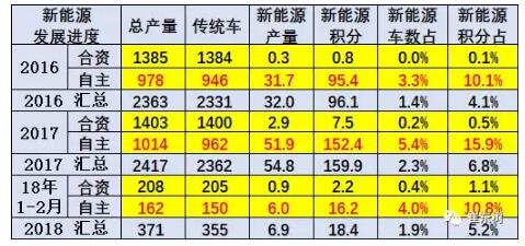 17年1-12月的新能源車銷量占比2.3%,較16年全年的1.4%有了大幅改善提升,18年的1-2月新能源車銷量占達(dá)到1.9%。其中合資企業(yè)的改善較小,18年自主產(chǎn)量6萬臺(tái),表現(xiàn)較強(qiáng)。