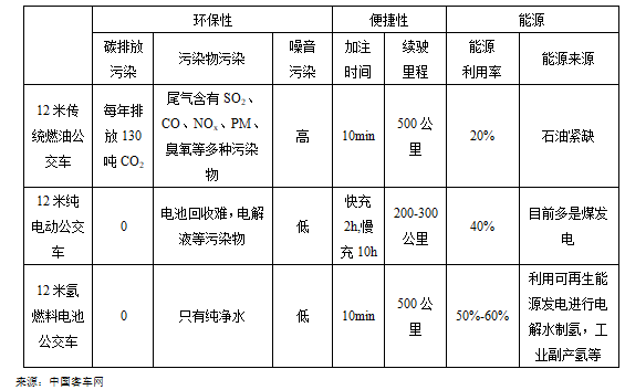 表1 氫燃料電池汽車(chē)與傳統(tǒng)汽車(chē)、純電動(dòng)汽車(chē)對(duì)比(以12米公交車(chē)為例)