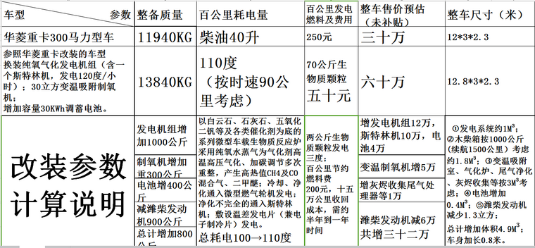我們知道,木柴、秸稈、煤炭等的眾多氣化技術(shù)中,使用純氧、水蒸氣氣化使所得氣體燃值大幅度提高,二氧化碳比例減少,若進一步加氫、加碳重整則氣體燃值更高(例如獲得高濃度二甲醚),從而克服氣化技術(shù)燃值低、不穩(wěn)定的缺陷,在車載制氧機利用尾氣余熱變溫吸附制取高純氧氣后,生物質(zhì)或煤炭等利用車載設備制取高熱值氣體成為可能,由于這一工藝流程很長,用于乘用車顯然太勉強,但經(jīng)細心設計還是可用于重卡等大型車輛的,例如各小型反應釜也采用類似變溫吸附制氧技術(shù)的容器一、容器二之類輕便緊湊結(jié)構(gòu),下面是改裝參數(shù)對比: