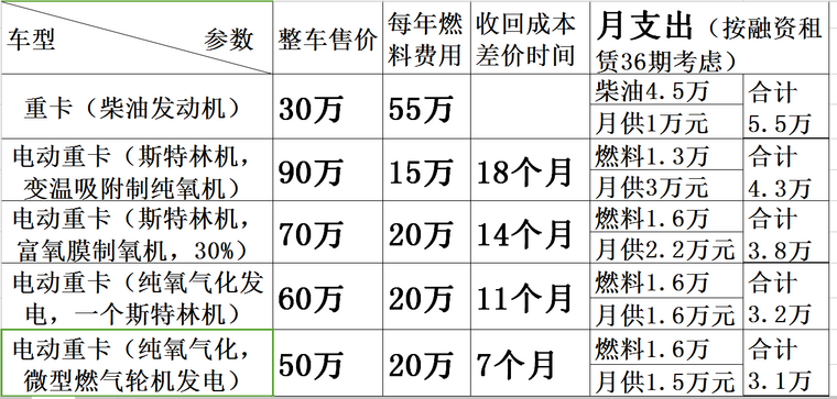 我們知道,重型商用車節(jié)能的意義比轎車更大。1輛重卡1年消耗的燃油,相當于60輛轎車消耗的燃油,而我國乘用車1.2億輛,商用卡車三百萬輛,折算1.8億輛的排放量遠超出乘用車。前一篇文章介紹的以車載斯特林發(fā)電機取代動力電池的電動重卡車型,由于斯特林機價格昂貴,因此售價預計為普通柴油機重卡的三倍整,但由于節(jié)約了大量燃油費用,因此仍然是合算的,不過推出本車型后,售價降低近30萬,更富有競爭力。實際上還可進一步降低造價,例如取消所有斯特林機;增設高壓儲氣罐,用于儲存氣化重整產(chǎn)生的高熱值氣體(易于液化的甲醇、二甲醚居多),就可以進一步減少調(diào)蓄電池容量而不影響啟動、加速、爬坡等階段用電。下面是這類電動重卡的經(jīng)濟分析(按每月行程兩萬公里,或年行程二十四萬公里考慮):