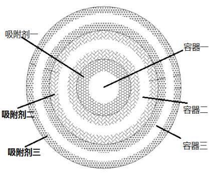 針對吸附劑比熱容大變溫時間長、急速反復變溫易于破碎等缺陷進行大量的相應設計,包括吸附劑內(nèi)設置骨架增強應力抵抗、設置導熱油或熔鹽等二次加熱(冷卻)體系加速變溫、電子制冷片輔助迅速降溫、溫差變化較大處兼做發(fā)電片等。工作溫度最高的吸附劑一裝入容器一,容器一完全被容器二包裹;工作溫度低于吸附劑一的吸附劑二裝入容器二中,容器二完全被容器三包裹;工作溫度比吸附劑二低的吸附劑三裝入容器三中;以此類推。各容器均為隔熱保溫容器,控制其內(nèi)部壓力同時變化,滿足執(zhí)行變壓吸附操作仍盡可能減少容器重量,如下圖所示意: