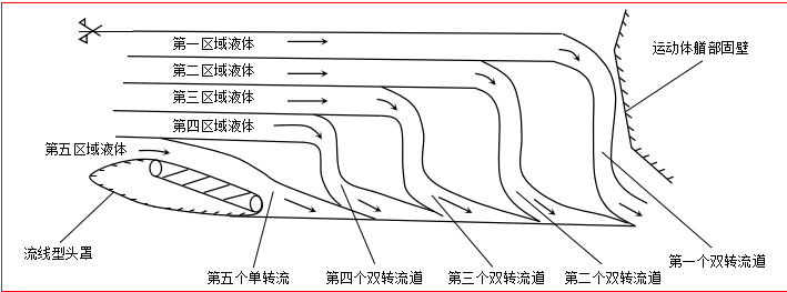 而如果速度較大的船舶、飛艇等場合,就必須控制從兩側(cè)排除流體的動量改變量,進一步減少能量損失而提高速度,如下圖所示意,被減阻航行體橫截面上的流體被劃分成多個區(qū)域,每個區(qū)域的流體都進入對應的流道,其中流體發(fā)生一次轉(zhuǎn)向的暫稱為單轉(zhuǎn)流道,發(fā)生二次轉(zhuǎn)向的稱為雙轉(zhuǎn)流道。在改變了一個較小的速度方向后分散并分別排在航行體艏部兩側(cè)前端較長的距離上,再流向航行體尾部,這樣排向兩側(cè)的流體動量基本上沒有大的改變,相應的航行體動量也不會有大的改變,卻使其形狀阻力(含船舶中的興波阻力等)進一步大幅度減少。