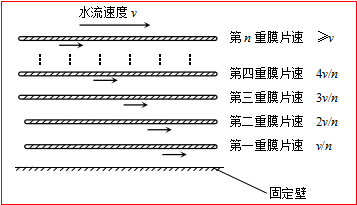 3.2:減少流體摩擦阻力:對于減少摩擦阻力,由于摩擦阻力與流體、物體表面(即邊界面)之間的相對速度成正比,高效流體減阻技術(shù)的方案是使用人工裝置進行強制干預,該裝置布設在需要減阻的物體表面,它依次布置至少一重的一到多重可活動“減阻膜片”群從而將邊界面與物體表面分離,使其能與流體共同運動,從而使“新表面”與流體相對速度為零甚至為負數(shù),也就減少乃至消除摩擦阻力;同時控制各層膜片運行位置,使各層膜片相互之間可自由活動而保持相對穩(wěn)定,各重膜片自動生成一定的速度差,進一步減少內(nèi)部運行阻力,如下圖所示意: