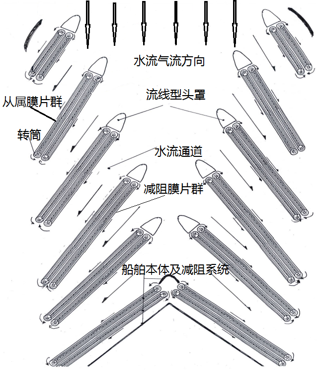 3.4:具體應用設計:這是基本原理簡介,在內(nèi)流領域應用比較好理解,只在內(nèi)、外管之間需要再布設多重減阻膜片減少相應的流體摩擦阻力就行了;而在外流領域(如飛艇、艦船、潛艇、魚雷、高速列車等),其頭部流體就要作特殊處理;在外流時涉及形狀阻力減阻和摩擦阻力減阻。首先是將運動體頭、尾部形狀阻力問題解決以擺脫流線型線的限制,再在其狹長的兩側(cè)布置摩擦阻力減阻裝置,方案是:在航行體艏部(頭部)將航行體迎流面途經(jīng)路徑上的流體通過內(nèi)部流道分散排向兩側(cè)比較長的距離上,從而將很復雜的(外流)艏部形狀阻力減阻轉(zhuǎn)化為相對較簡單的內(nèi)部流道摩擦阻力減阻,以較低速度的船舶為例: