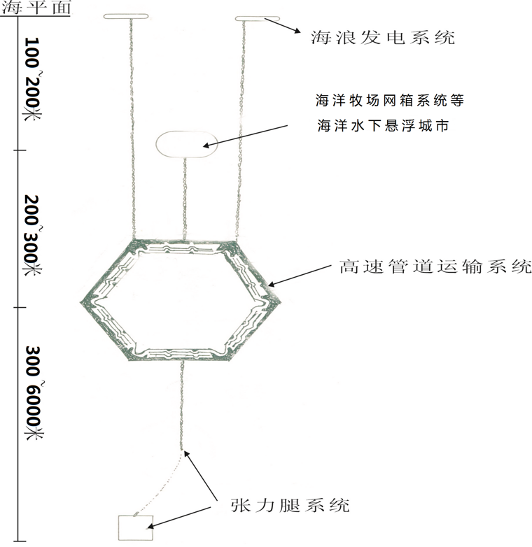 同樣這一系統(tǒng)兼具貨運功能,年運貨能力輕易突破達百億噸以上,克服了船運速度慢、受氣候影響大的缺陷,可逐步取代世界遠洋輪船貨運;生產(chǎn)、生活資料可以很方便地配送到遙遠海域,現(xiàn)有大尺寸壓力容器價格不斷降低,可用于設計建造水下懸浮建筑,這樣海面下的懸浮居住系統(tǒng)(城市)可大量建成,如下圖所示意: