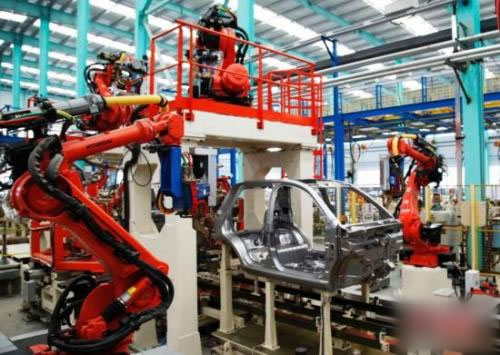 資料圖:新能源汽車制造車間內,工業(yè)機器人正在進行沖壓、焊裝、總裝等生產活動。 劉昌勇 攝