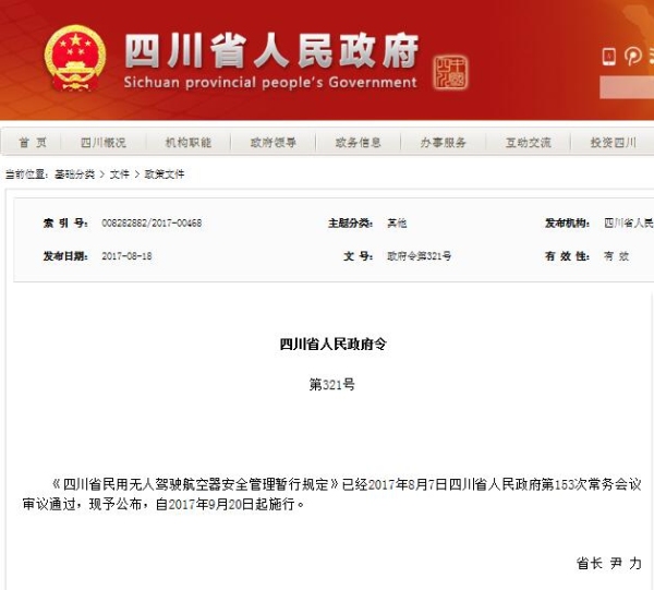 8月18日,四川省人民政府發(fā)布了《四川省民用無人駕駛航空器安全管理暫行規(guī)定》自2017年9月20日起開始實行。