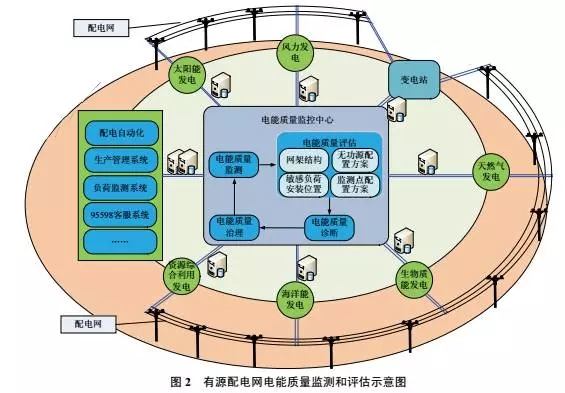 隨著分布式電源不斷地接入配電網(wǎng),逐步形成了小、中、大規(guī)模的有源配電網(wǎng)。伴隨著分布式電源的功率波動,配電網(wǎng)中的電能質量經(jīng)受著較大的沖擊。通過收集配電網(wǎng)中的運行數(shù)據(jù)、負荷數(shù)據(jù)、分布式電源運行等數(shù)據(jù),能夠開展配電網(wǎng)中的電能質量分析和評估研究,從而得出精細化的配電網(wǎng)網(wǎng)架和無功源的調節(jié)方案等。有源配電網(wǎng)電能質量監(jiān)測和評估示意圖如圖2所示。