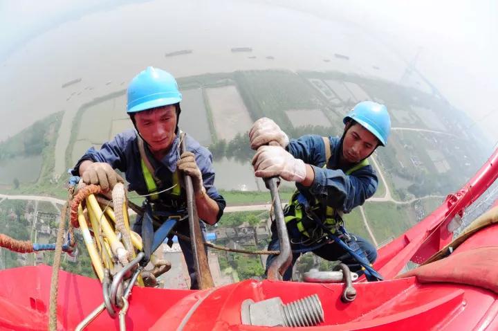 安徽送變電工程公司施工人員在220米高空中安裝±1100千伏特高壓長(zhǎng)江大跨越鐵塔橫擔(dān)。(鄭賢列)