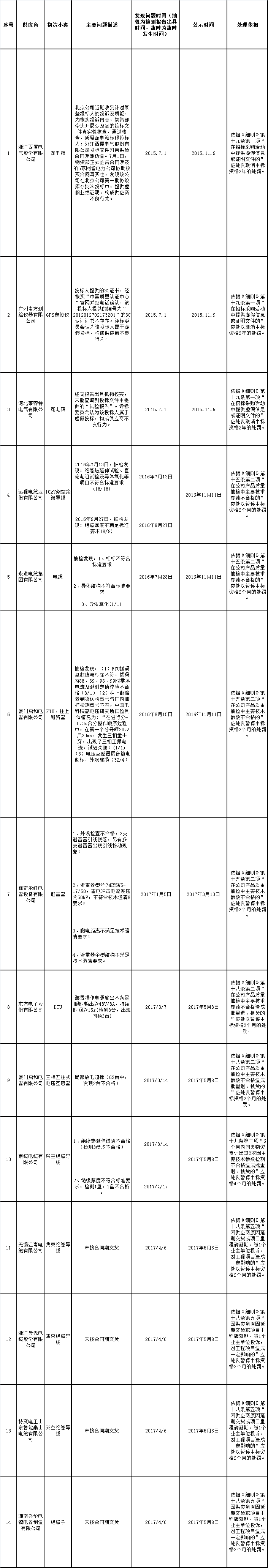為促進供應(yīng)商誠信履約,保證產(chǎn)品質(zhì)量,確保電網(wǎng)建設(shè)順利進行及安全可靠供電,依據(jù)《國家電網(wǎng)公司供應(yīng)商不良行為處理管理細則》(以下簡稱《細則》)的有關(guān)規(guī)定,對出現(xiàn)重大產(chǎn)品質(zhì)量問題、履約不誠信等問題的供應(yīng)商進行了處理。具體處理情況如下:
