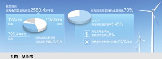“2017年,青海新能源棄電率為5.45%,風電實現(xiàn)了全消納,新能源增發(fā)率達8%,光伏發(fā)電年利用小時數(shù)為1515小時,居全國前列。”李延和介紹,“十二五”期間,青海省風電平均年利用小時數(shù)1700小時左右,截至2017年,青海省清潔能源消納比重已達70%,遠高于全國平均水平。